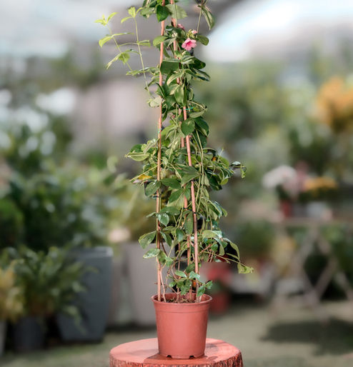 מטפס מרהיב עם פרחים גדולים ובולטים בגווני ורוד או צהוב, מוסיף צבע חיוני.