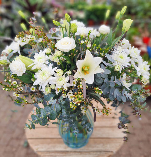 זר לבן ליזיאנטוס - חרציות - שושן צחור וירק.