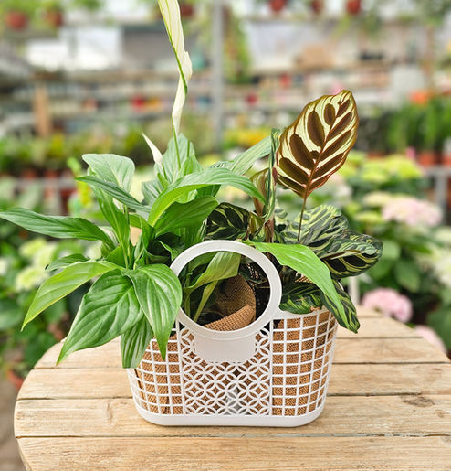 1. עציץ ספטיפיליום קוטר 12 ס"מ בעל פריחה לבנה אלגנטית וחגיגית + מעטפת יוטה + בקבוק יין דרך ארץ לבן